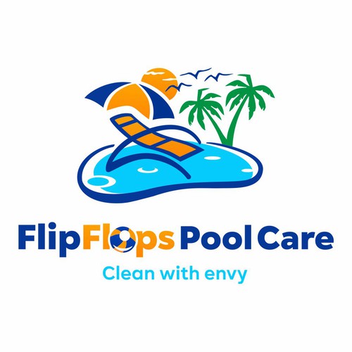 Pool cleaning service. Home owners with pools. Middle to upper class. Fun logo. Bold print. Flip flops illustration, P