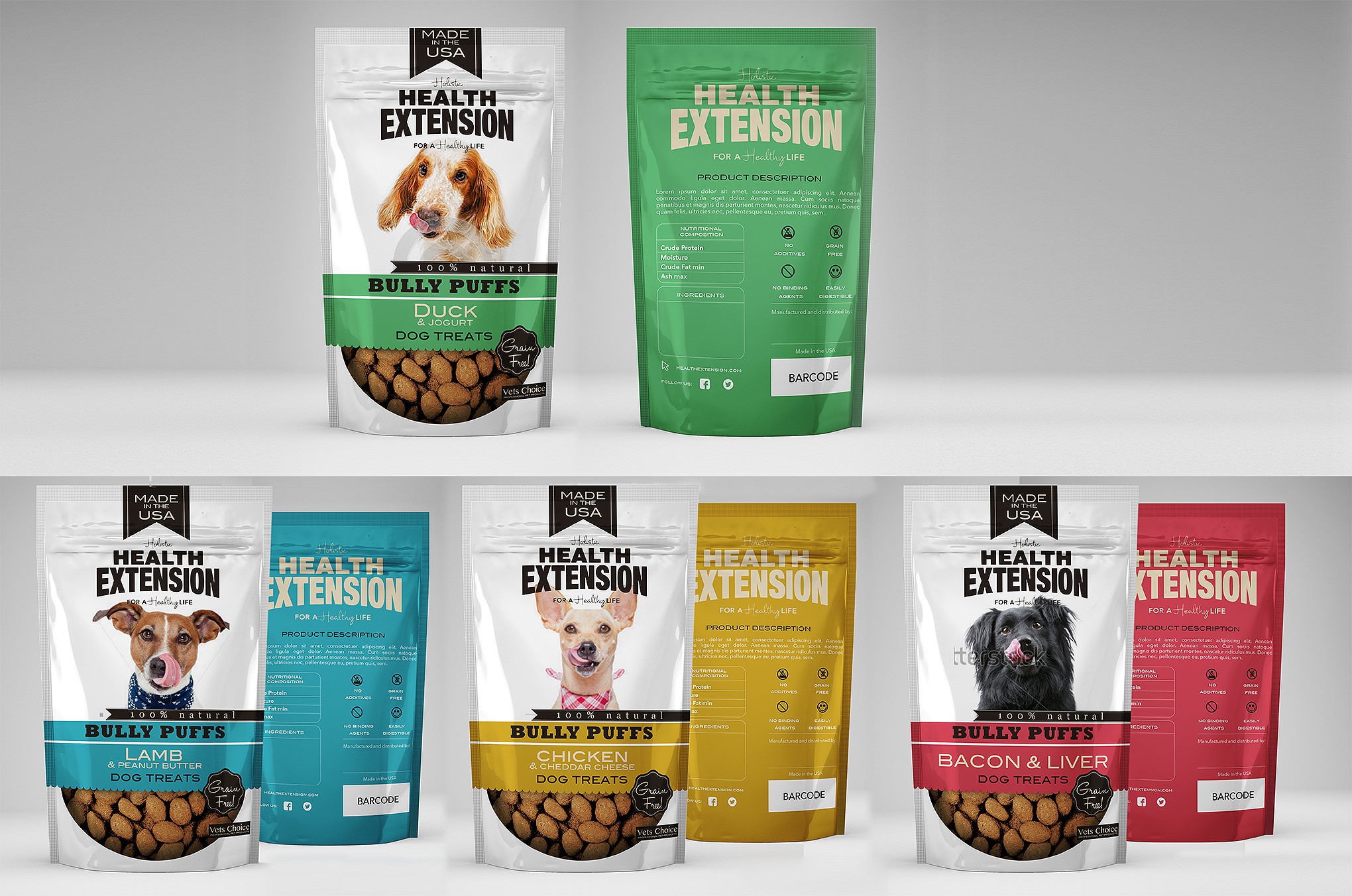 Create a fresh line of 9 different dog treats (in fully printed pouches)